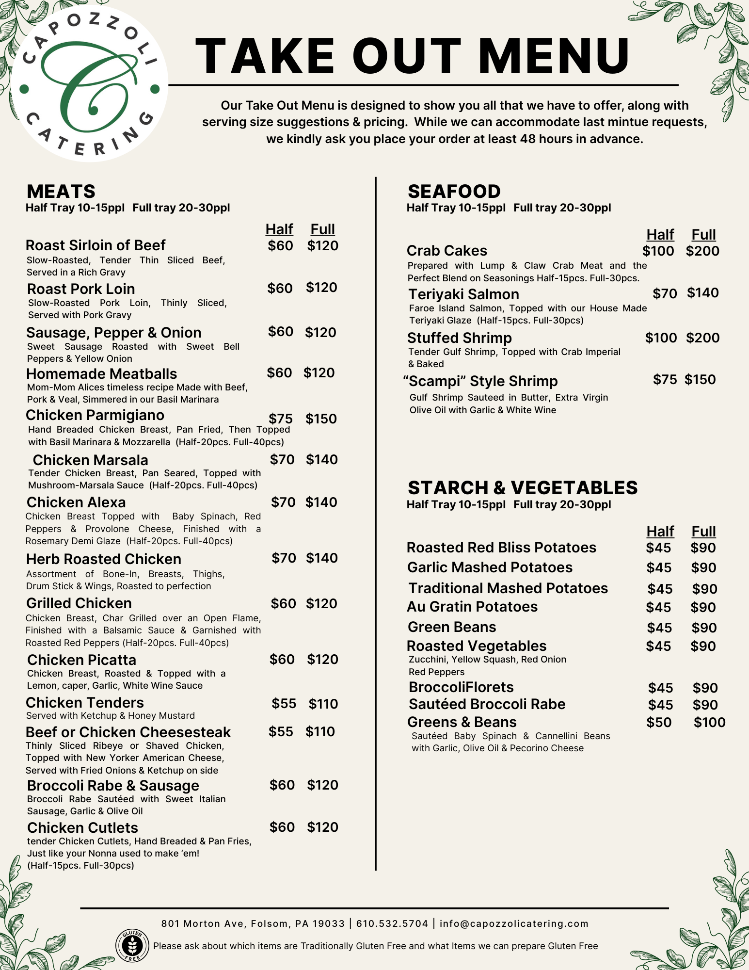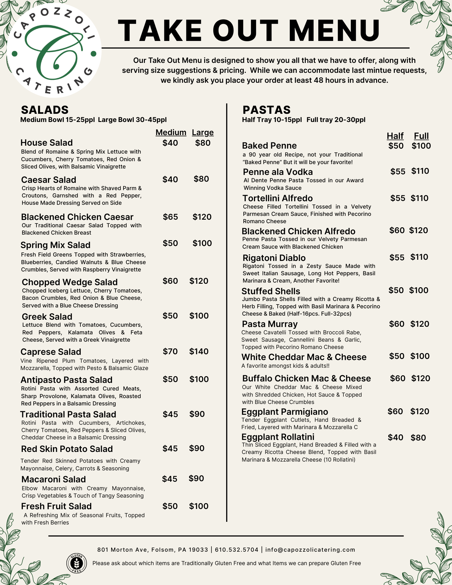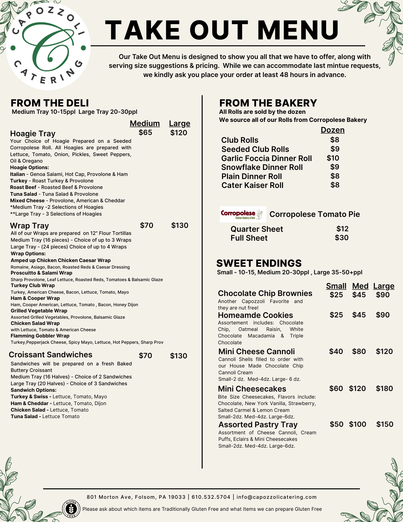 including classic Italian favorites, crowd-pleasing entrées, pastas, salads, sides, sandwich trays, and desserts.